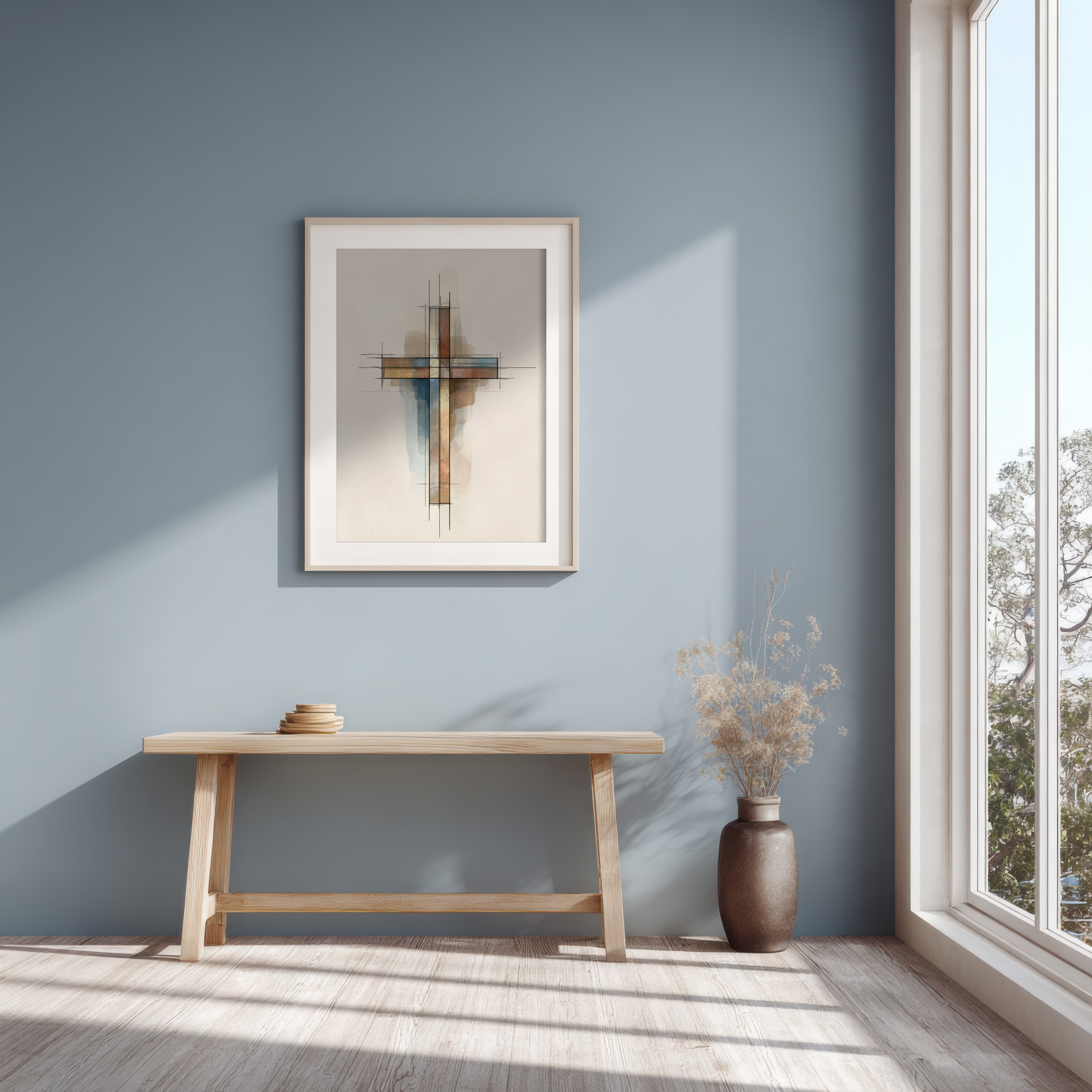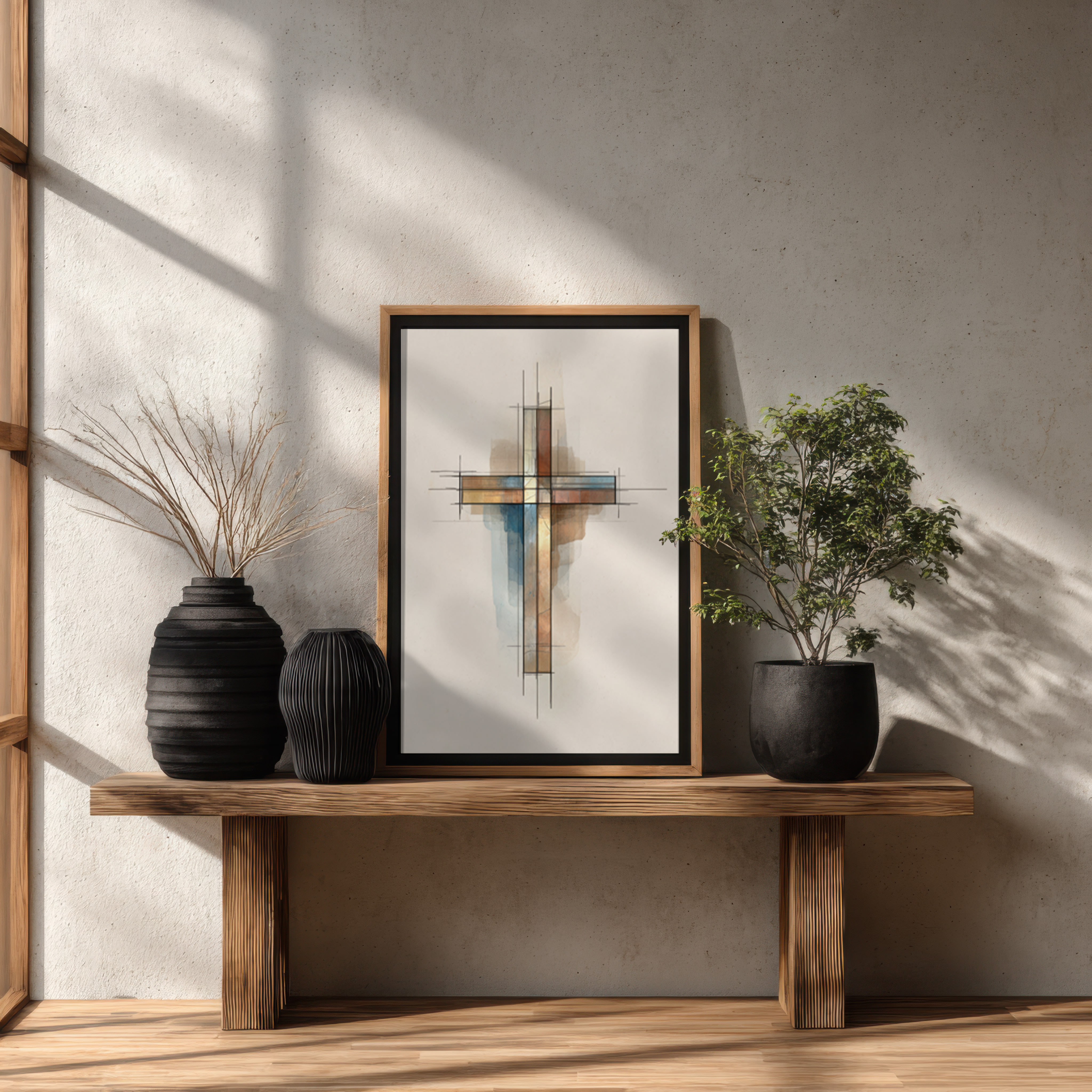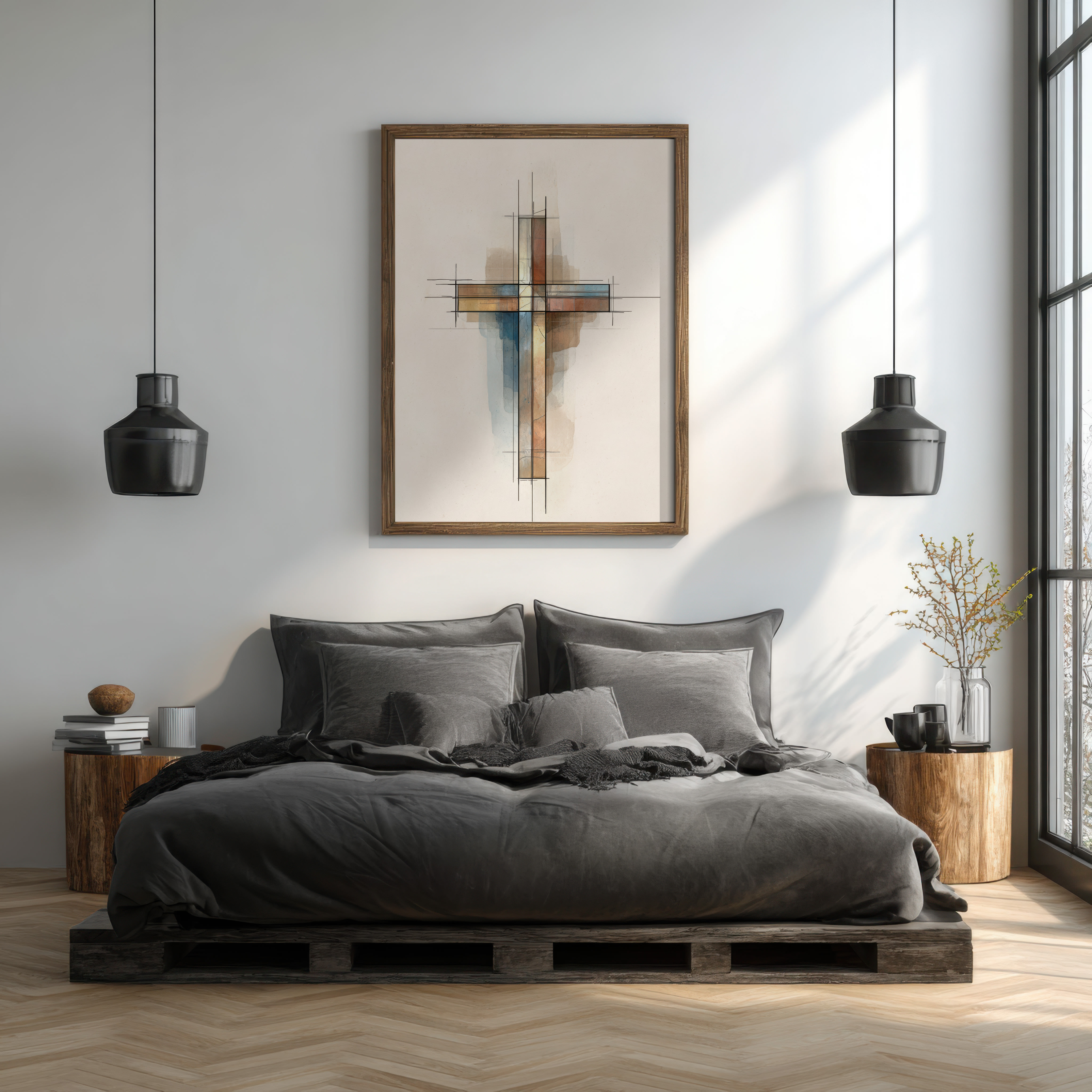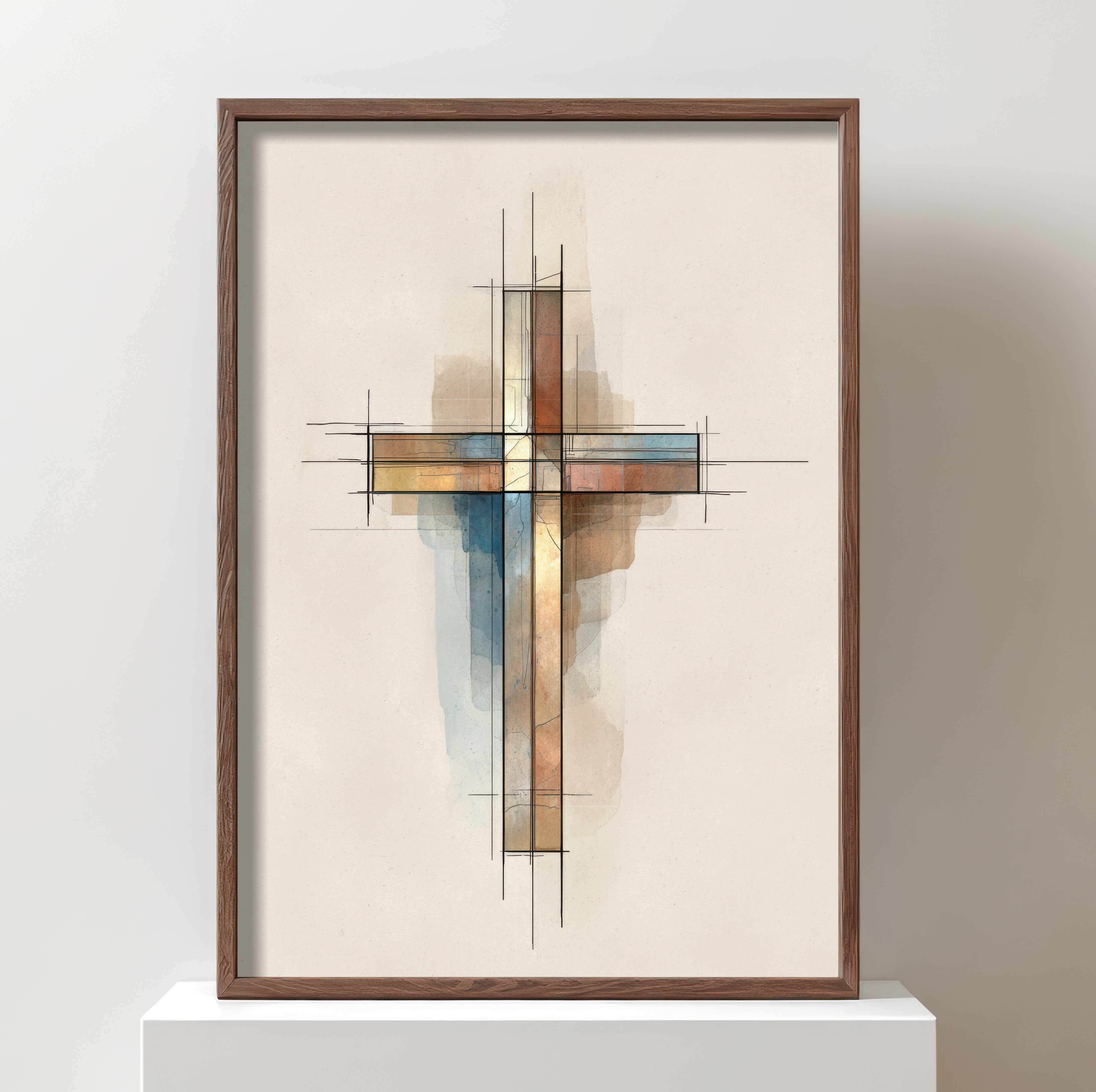 Embracing a minimalist style, this piece utilizes clean lines and soft colors to portray the cross. The interplay of multicolors adds depth, capturing the light and shadow with subtle elegance, making it a striking focal point that resonates with tranquility.